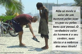 “Não se mede o valor de um homem pelas suas roupas ou pelos bens que possui, o verdadeiro valor do homem é o seu caráter, suas ideias e a nobreza dos seus ideais. ” (Charles Chaplin)